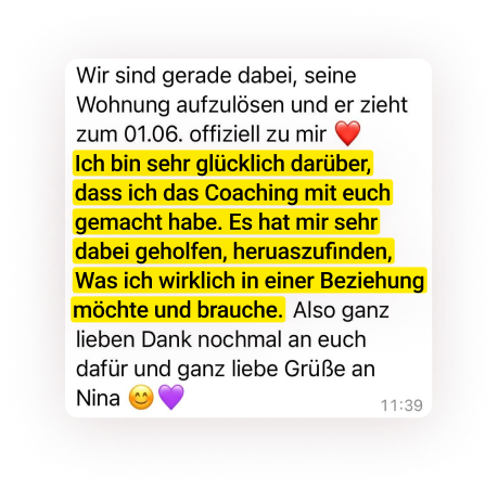 In den letzten 5 Jahren hat sie gemeinsam mit ihrem 8-köpfigen Team bereits über 600 Frauen dabei geholfen, ihre inneren Blockaden zu lösen, bessere Männer anzuziehen und eine erfüllende Partnerschaft zu finden und zu führen.