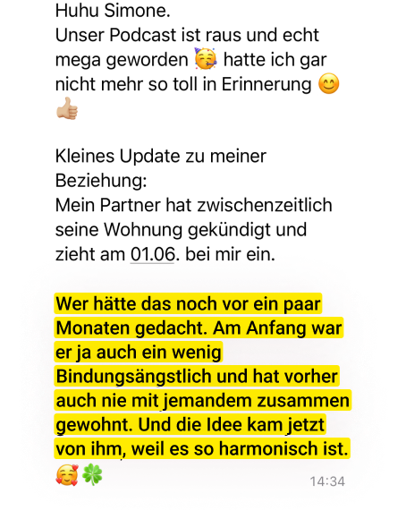 Alleine im letzten Jahr hat Simone, gemeinsam mit ihrem Team, rund 320 Frauen geholfen, Antworten auf Liebesfragen zu erhalten, einen Partner zu finden, aus toxischen Beziehungen auszubrechen, sich selbst zu lieben und eine erfüllende Beziehung zu führen.