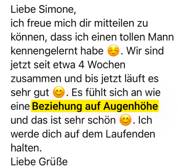 Nachdem sich Simone 10 Jahre durch ein Studium, diverse Seminare, Weiterbildungen und Coachings im Bereich der Persönlichkeitsentwicklung und menschlicher Psychologie Wissen angeeignet hat, konnte sie ihre Themen im Bereich Beziehungen und Partnerschaft erfolgreich bearbeiten und den Weg in eine erfüllte Partnerschaft (und heute Ehe) finden.